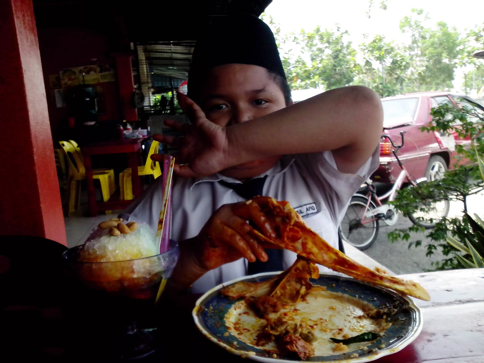 Pada bulan April lepas adalah birthday papa dan comel Sya sya..... Kami hanya menyambut di Kampung Pasir Putih.... Itupun lewat sebab masa birthday tu suami berada di Utara... Maka, kami sambut serentak ler..... Menu yang first time aku makan kat sini adalah sup merah gear box.... gear box lagi.... hah memang dah nama kaki kambing..... So, pantang jumpa ler.... Order ler satu pinggan.... harga dia RM9 juga x silap tapi dimakan bersama garlic bread.... Garlic bread nia okey tapi sup dia pekat sangat... aku kureng suke.... tapi bila dapat makan maka aku tahu ler rasa sup merah rupanya cengini.... hi hi hiiii.....